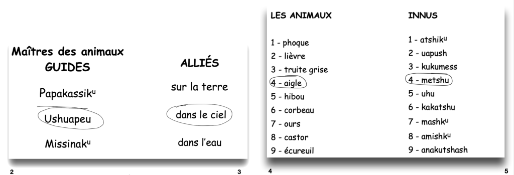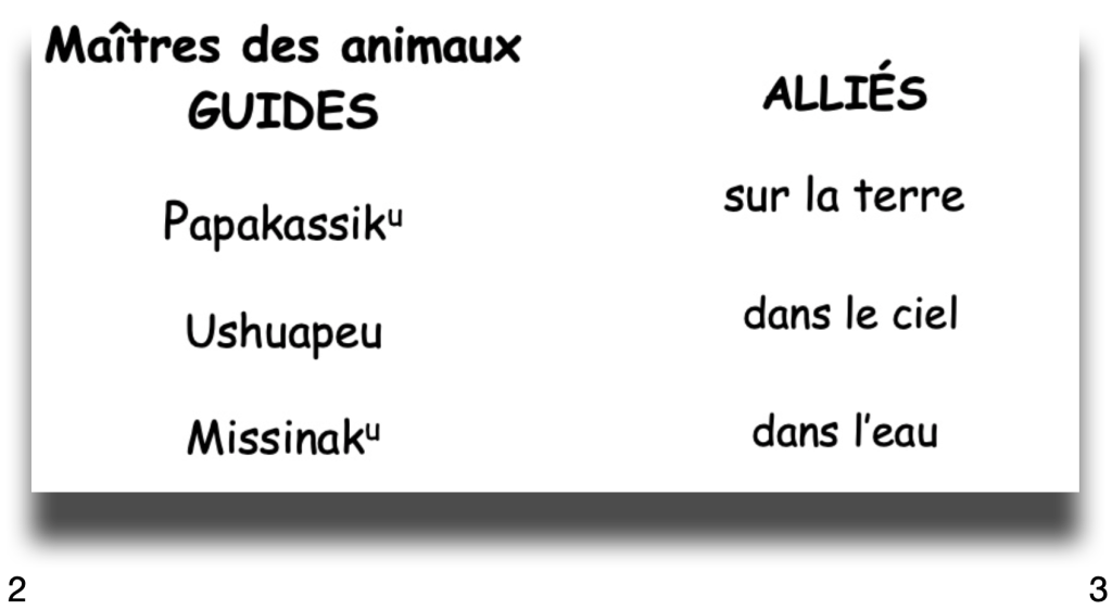 4. Écrire au tableau — Ouvrir une discussion sur diverses traditions (guides et alliés) transmises par les Anciens : qui sont les maîtres des animaux selon les Innus ? Papakassiku est le maître des animaux terrestres, Ushuapeu est le maître des animaux volants et Missinaku est celui des animaux aquatiques. Coller une photocopie ou écrire, pages 2 et 3.