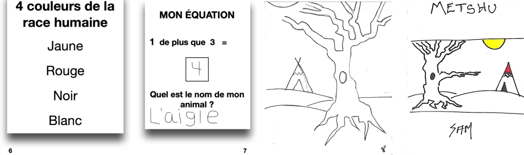– L’enseignant s’assure que les éléments suivants figurent dans les carnets de traces : nom d’un maître entouré (page 2), somme d’une équation et nom d’animal (page 7), nom d’un animal en français et en langue innue entouré (pages 4 et 5), éléments dessinés (page 8), éléments organisés dans l’espace (page couverture), animal inséré.