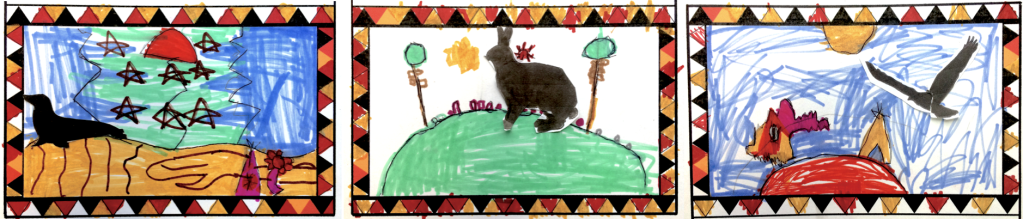 PAGE COUVERTURE : écrire son nom en bas, au centre ; dessiner un rectangle à main levée ; placer des éléments retrouvés dans l’environnement d’un animal à l’intérieur du rectangle ; écrire le nom d’un animal en langue innue, en haut de la page, voir : http://dictionnaire.innu-aimun.ca/Words.