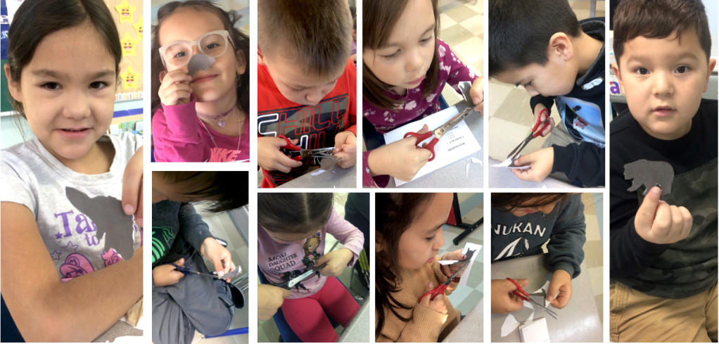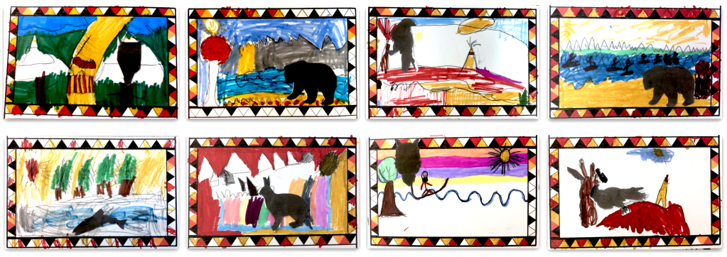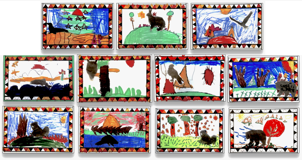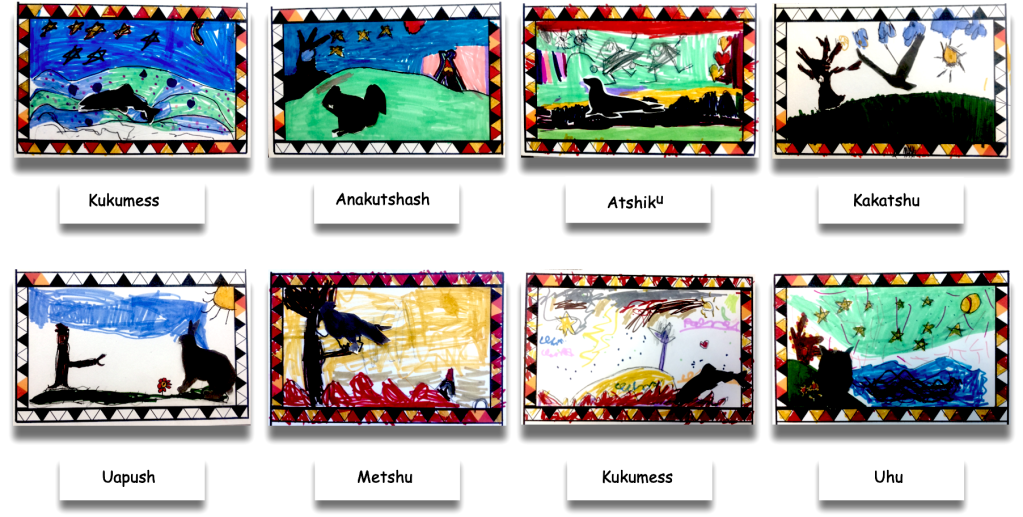 Écrire le nom des animaux en langue innue sur une petite carte et placer sous chaque réalisation.