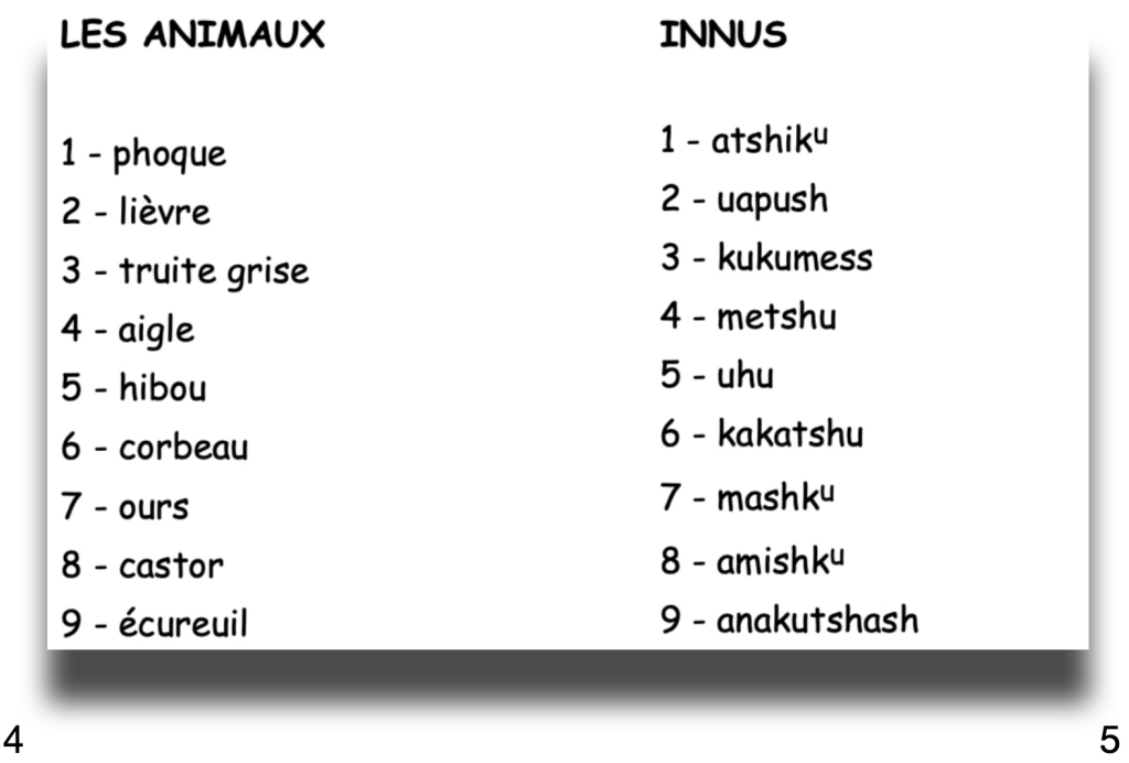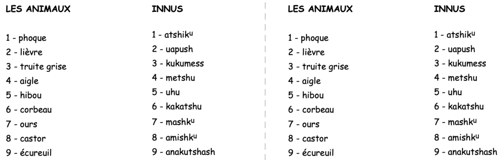 – une photocopie de la liste de noms d’animaux en français et en langue innue