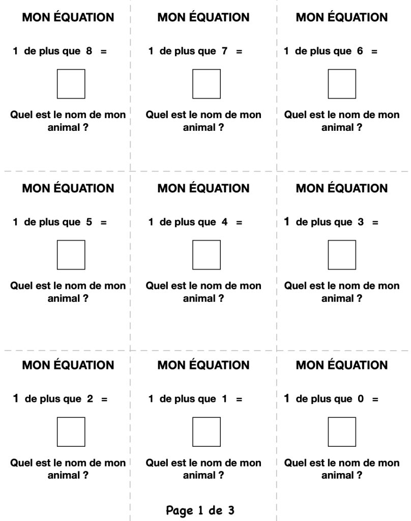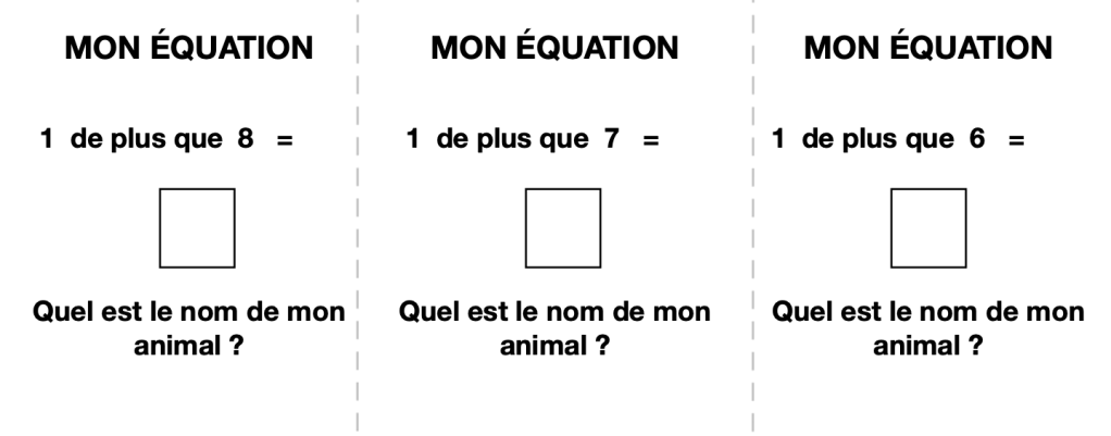 Page 7 : coller une photocopie et résoudre l’équation ; écrire le nom d’un animal.
