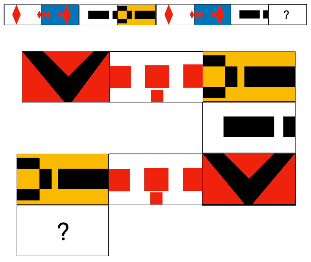 15. Décrire une situation de respect envers son groupe — Échanger deux des quatre assemblages avec un élève et placer les éléments de façon à créer une suite logique, soit par couleur : blanc, jaune, blanc, noir, blanc, jaune, blanc, noir… OU par forme : rectangle, losange, rectangle, losange OU ENCORE par nombre : 2, 4, 4, 3, 2, 4, 4, 3…