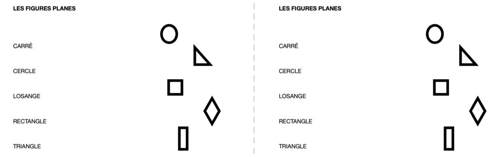 – une liste des figures planes et leur nom, format env. 4 x 5,5 po (1 par élève).