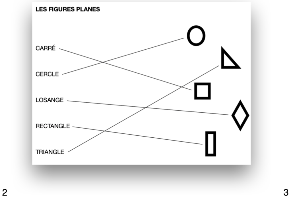 Page 2 : coller une photocopie des figures planes et leur nom ; relier les figures à leur nom.