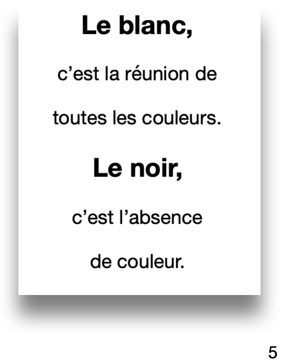 8. Qu’est-ce que le blanc et le noir en arts visuels ? Le blanc est la réunion de toutes les couleurs et le noir est l’absence de couleur, coller une photocopie, page 5.