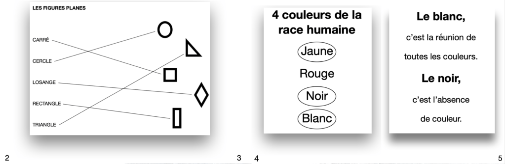 – L’enseignant s’assure de la compréhension de l’élève et vérifie que la collecte de l’information est conforme aux attentes : figures planes reliées à leur nom (pages 2 et 3), figure plane (collée) et son nom (page 6).