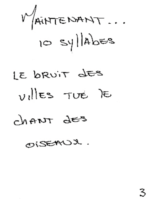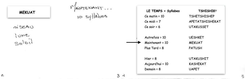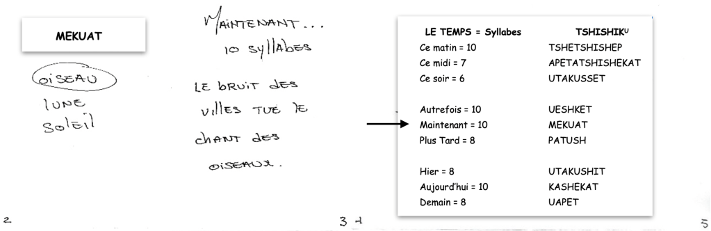 – L’élève écrit un message sur la notion du temps, soit une petite phrase correspondant à son adverbe de temps à la page 3 de son carnet de traces, en incorporant un des trois mots écrits à la page 2. Compléter les phrases en équipe, par exemple : MEKUAT (maintenant = 10 syllabes), le bruit des villes tue le chant des oiseaux.