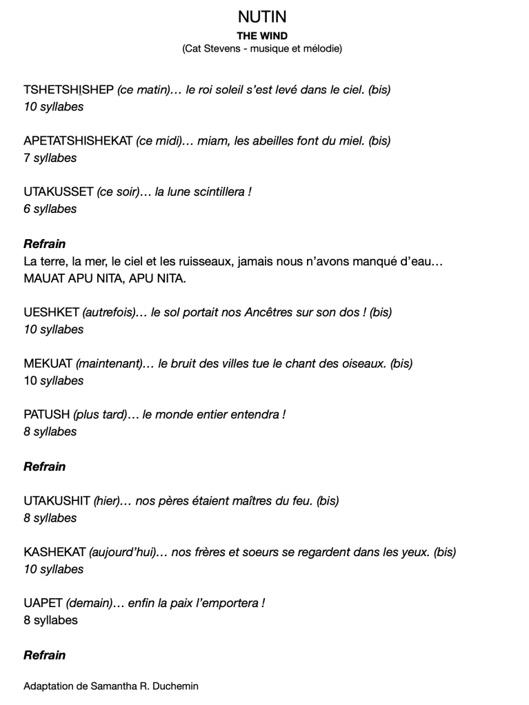 10. Performance de l’artiste sur une guitare à 12 cordes de la musique de la chanson de Cat Stevens, The Wind. L’artiste remplace les couplets par les phrases des élèves et change le refrain par une phrase en français et en langue innue. Par exemple : « La terre, la mer, le ciel et les ruisseaux, jamais nous n’avons manqué d’eau…