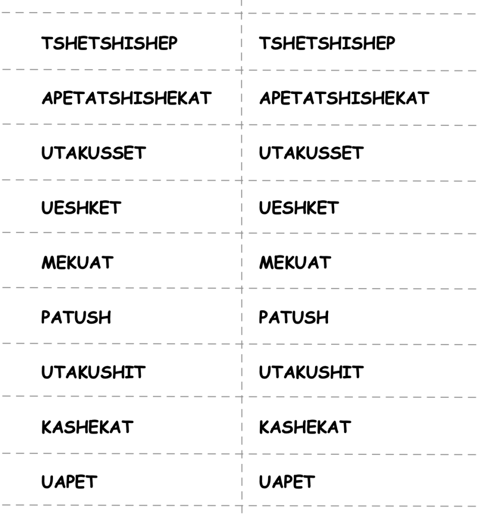 5. Coller une photocopie d’une liste d’adverbes de temps en français et en innu-aimun (ce matin /TSHETSHISHEP, ce midi / APETATSHISHEKAT, ce soir / UTAKUSSET, autrefois / UESHKET, maintenant / MEKUAT, plus tard / PATUSH, hier / UTAKUSHIT, aujourd’hui / KASHEKAT, demain / UAPET, pages 4 et 5. Voir : https://dictionnaire.innu-aimun.ca/Words.
