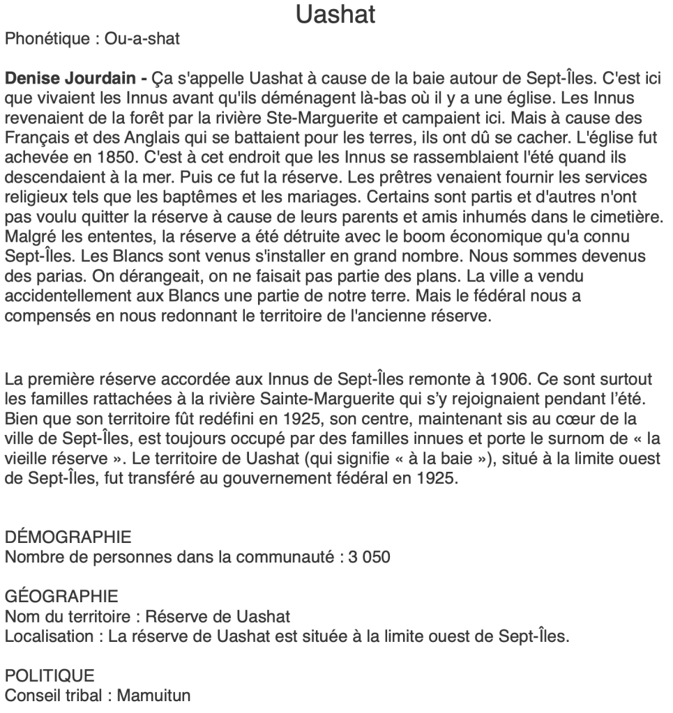 – le document sur les dates et les événements marquants de Uashat (1 par 2 élèves)