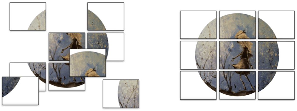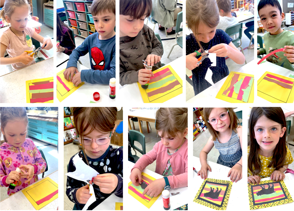 – L’enseignant s’assure de la compréhension de l’enfant : languettes de papier de couleurs alternées et collées à l’intérieur du cadre, pas de bande brune en haut de l’image et quelques endroits laissés en jaune.