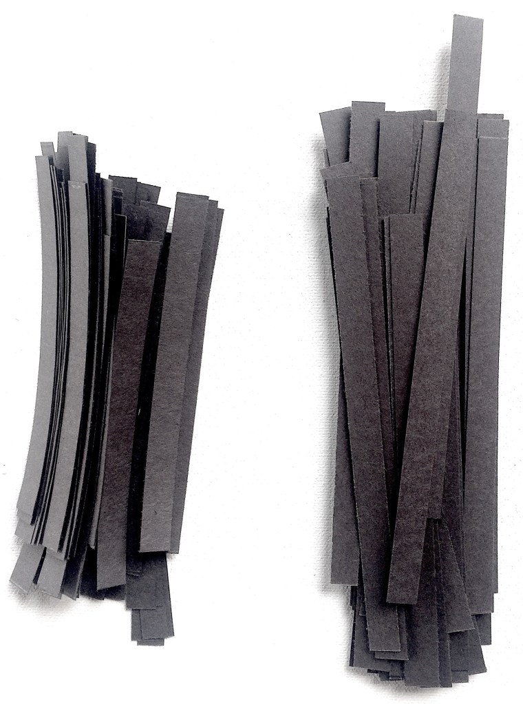 Couper des feuilles de papier (construction) noir, format 11 x 14 po en 2 et en bandes de 0,5 po pour obtenir un format de 7 x 0,5 po (2 bandes par enfant) et 4 x 0,5 po (2 bandes par enfant).