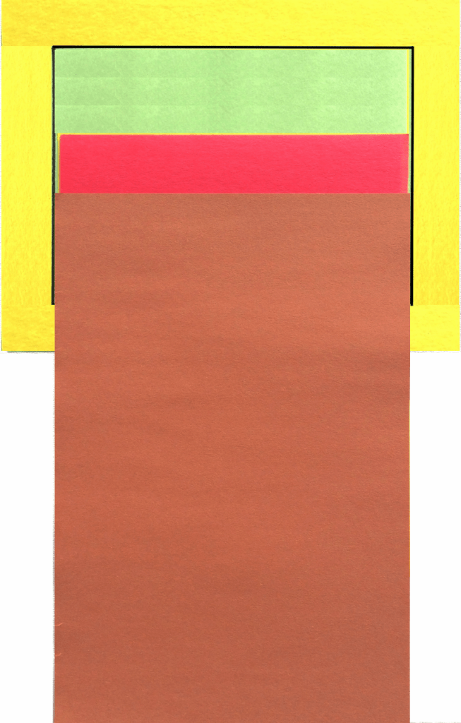 5. Accroître son développement physique et moteur — Donner à chaque enfant un papier jaune (un cadre a été préalablement tracé). Écrire son nom au verso. Que signifie « côté paysage et côté portrait » ? Placer le papier côté paysage. Démonstration : coller les languettes vertes, rouges et brunes sur le papier jaune à l’horizontale, à l’intérieur du cadre. Consignes : laisser des espaces jaunes de façon à créer de la lumière ; alterner les bandes de couleurs de façon à ce que la même couleur ne soit pas superposée. Ne pas dépasser le cadre et ne pas coller de bandes brunes en haut de l’image.