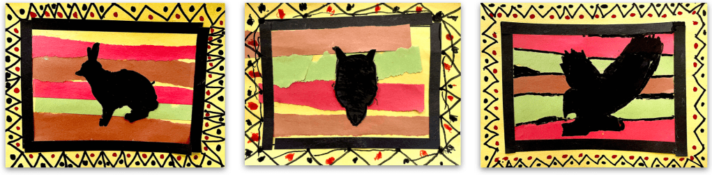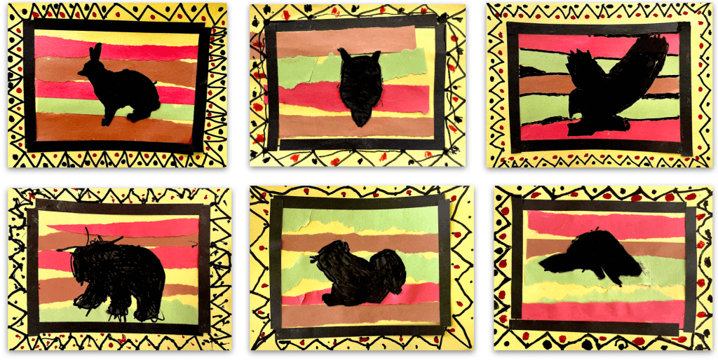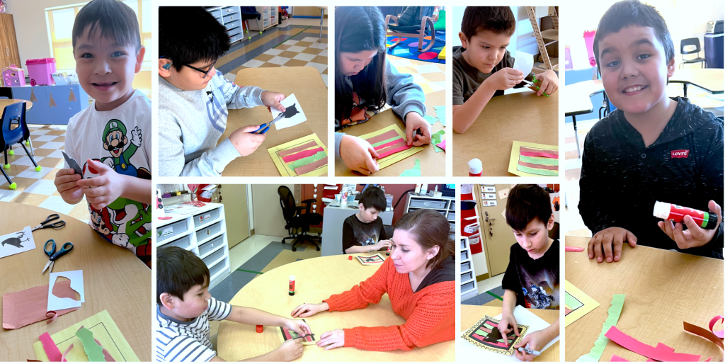 10. Donner à chaque enfant 4 bandes de carton noir : 2 bandes de 4,5 x 0,5 po et 2 de 6 x 0,5 pouces. Démonstration : coller des bandes de carton noir sur la ligne du cadre, en haut, en bas et de chaque côté. Trouver la bonne longueur de bande et coller au bon endroit.