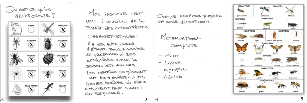 – L’enseignant s’assure de la compréhension de l’élève et vérifie que la collecte de l’information est conforme aux attentes : arthropodes cochés (page 2), photocopie de la morphologie d’un insecte volant (pages 7 et 8), photocopie d’un insecte en couleur et le nom « MANITUSH » en haut (page couverture).