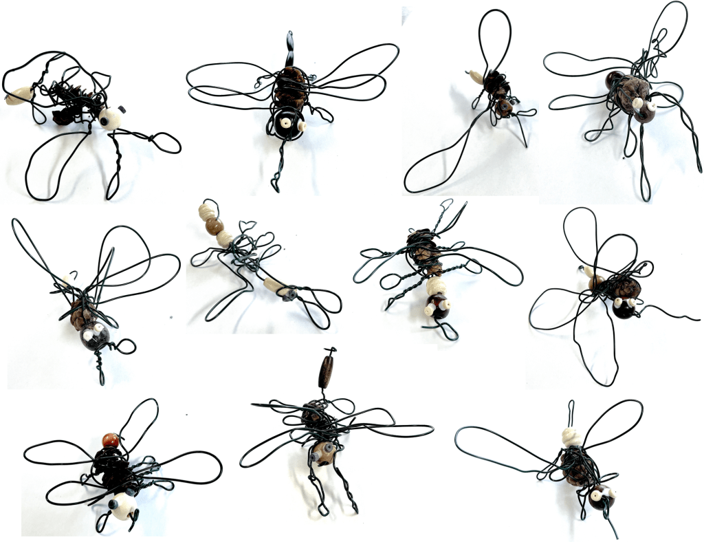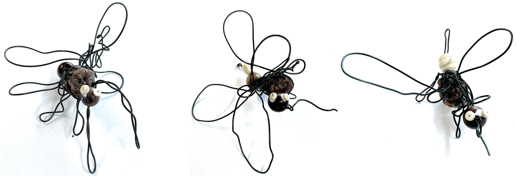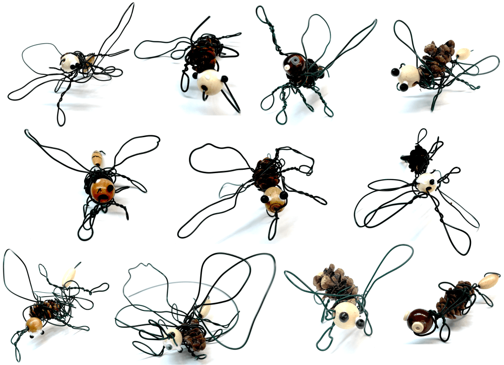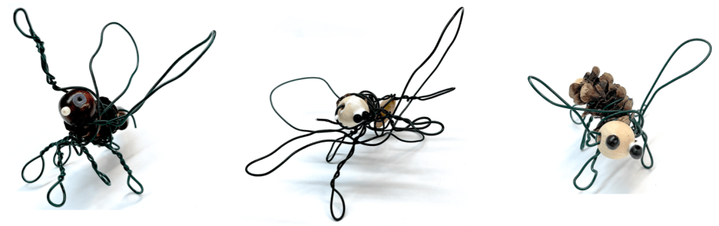 14. Démonstration — Réaliser un arthropode : placer un cône de pin (ou de sapin) au centre de sa table (thorax). Tenir fermement le cône dans sa main droite (si on est droitier) et dans l’autre main, saisir une extrémité du morceau de fil d’aluminium. Laisser 1 ou 2 pouces de fil libre (abdomen) et entourer le fil sur le cône (un tour seulement). ATTENTION : s’assurer que le fil soit assez long pour contenir la perle ; commencer par une des deux pattes postérieures et revenir sur le fil, enrouler le fil en utilisant les mêmes gestes que ceux réalisés sur le dessin, voir la page 6 du carnet de traces. Insérer une petite perle pour la tête et l’enrouler ; revenir sur la perle (entre le thorax et la tête) et continuer vers l’avant pour produire une antenne ; revenir sur le fil pour réaliser l’autre antenne. On peut continuer et terminer par une trompe (si trompe il y a). Couper le fil lorsque terminé. Insérer la grande perle à l’arrière pour l’abdomen. Pincer le fil vers le haut pour que l’abdomen reste en place.