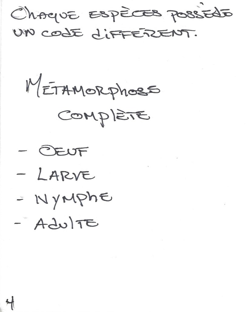 10. Écrire « Chaque espèce possède un code différent » en haut de la page 4 . À l’aide du document sur le développement des insectes, écrire « Métamorphose complète » ou « Métamorphose incomplète » selon son insecte ainsi que les étapes, soit : œuf, larve, nymphe, adulte, ou : œuf, nymphe, adulte.