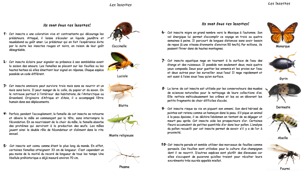 Jeu de connaissances sur les insectes (à imprimer)
