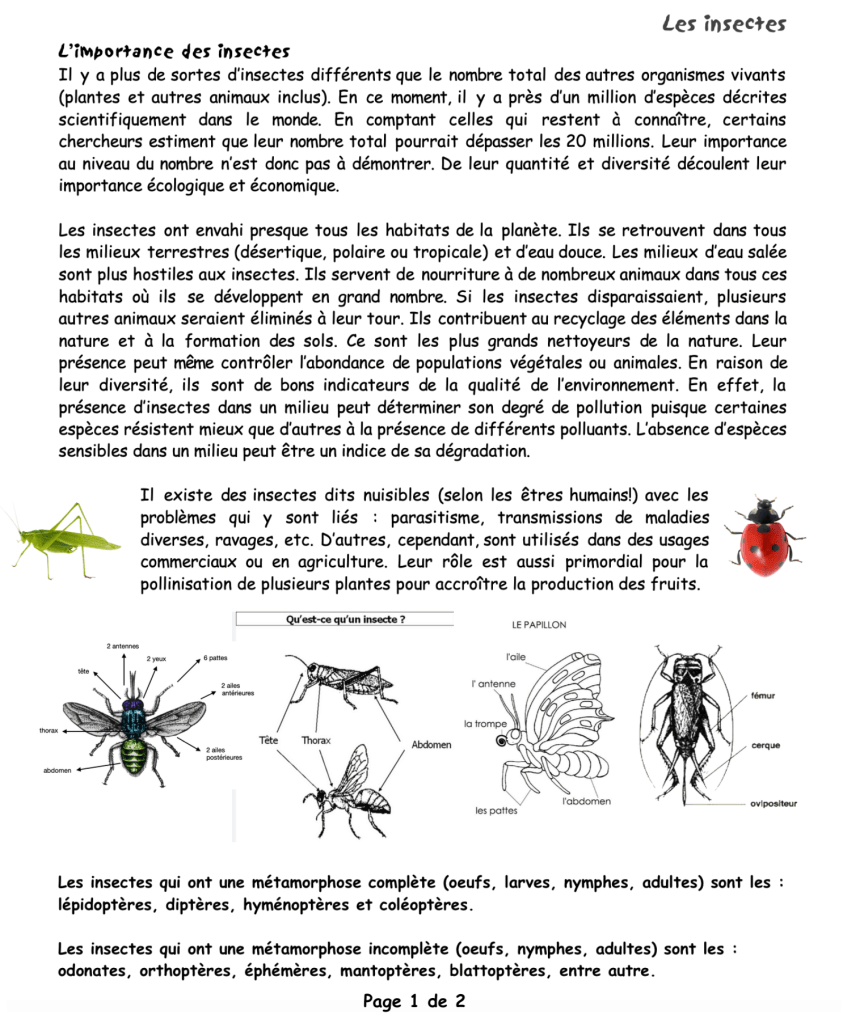 – une photocopie du document sur le développement des insectes et sur les arthropodes (1 par 2 élèves)