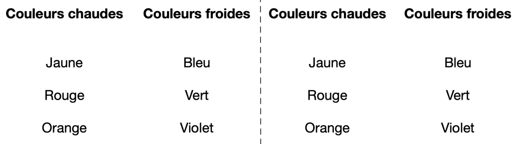 – le document sur les couleurs chaudes et froides, format env. 4 x 5 po (1 par élève)