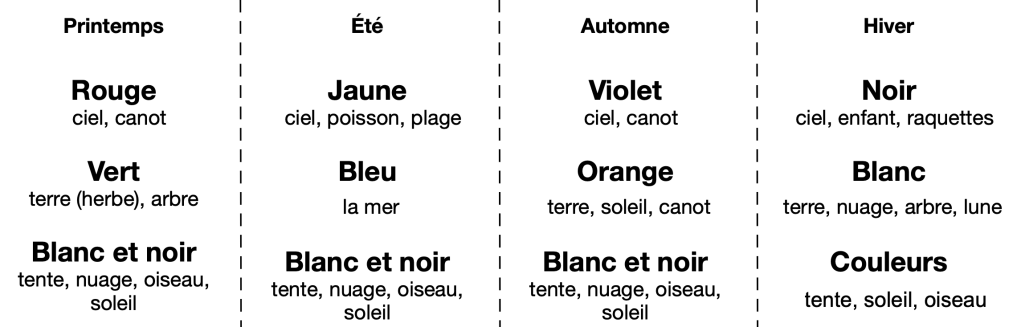 10. Écrire au tableau — Associer deux couleurs à chaque saison (se référer aux prototypes) : PRINTEMPS, rouge et vert – ÉTÉ, jaune et bleu – AUTOMNE, violet et orange – HIVER, blanc et noir (ombre et lumière). Entourer les deux couleurs de la saison choisie, pages 2 et 3.