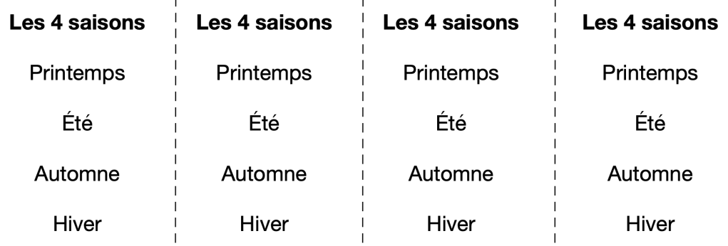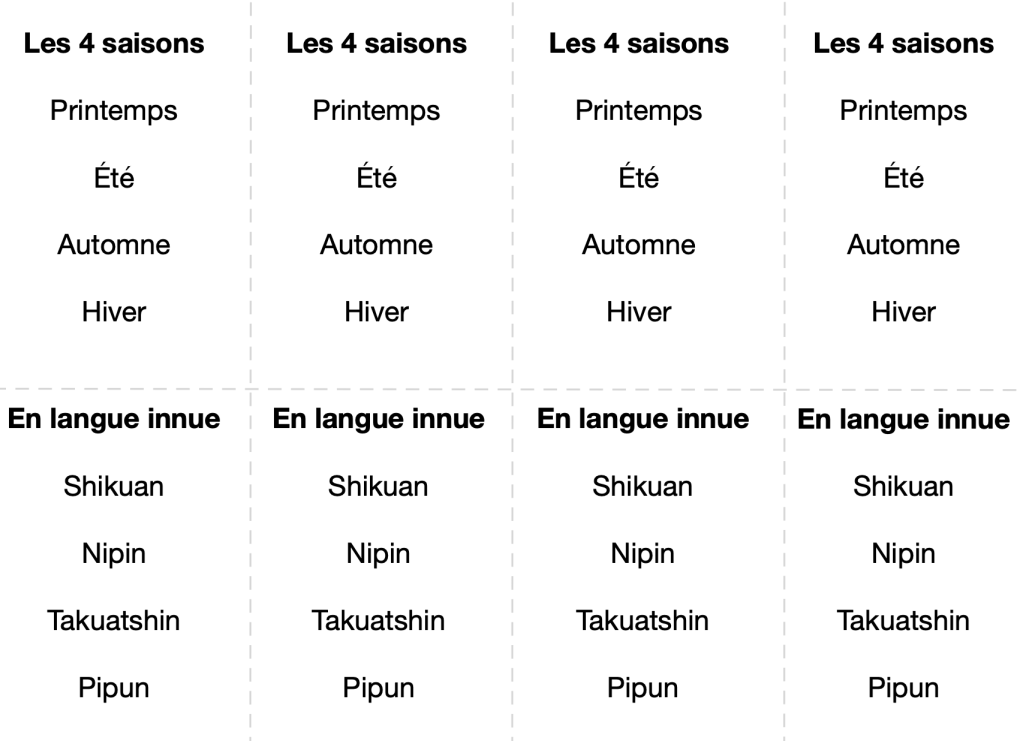 Imprimer et couper le nom des quatre saisons en français et en langue innue, format env. 4 x 3 po (1 par élève).