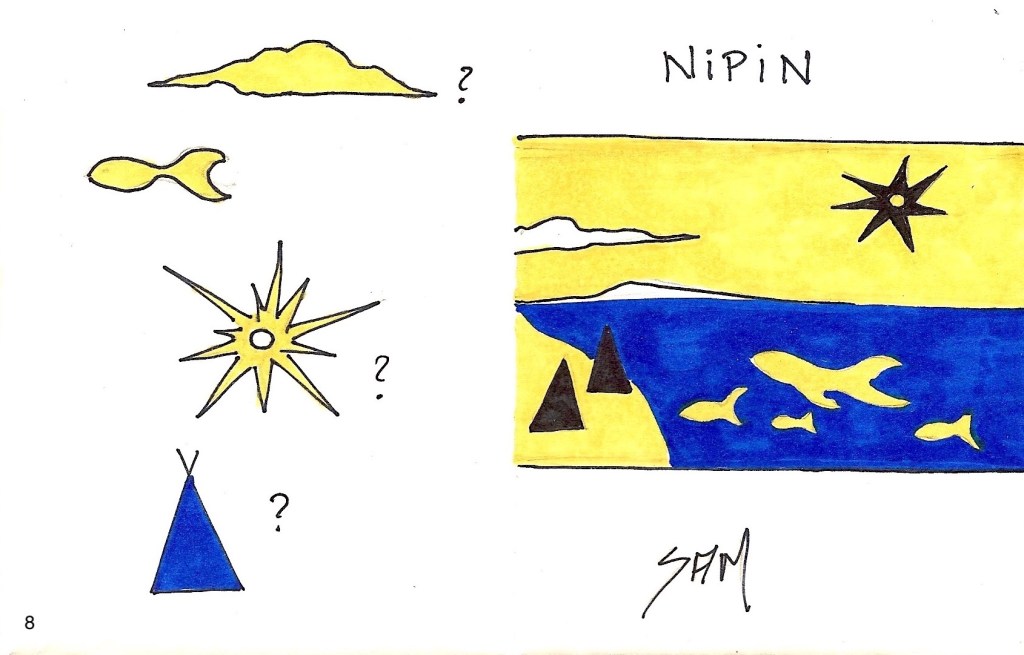 PAGE COUVERTURE : écrire son nom en bas, au centre ; dessiner et colorier une scène de vie innue ; écrire le nom d’une saison en langue innue en haut de la page, voir : http://dictionnaire.innu-aimun.ca/Words.