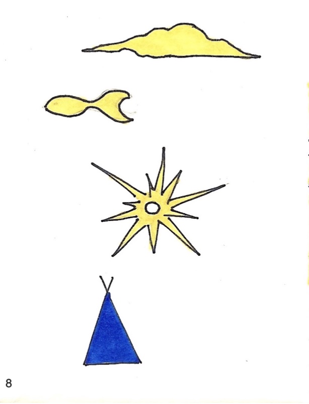 12. Dessiner des éléments retrouvés au campement innu selon la saison (p. ex. : en été, poisson, soleil radieux, petit nuage), page 8. (On peut choisir : une tente, un nuage, un oiseau, un soleil et un enfant pour les quatre saisons). Colorier les éléments en n’utilisant que les deux couleurs reliées à la saison choisie.