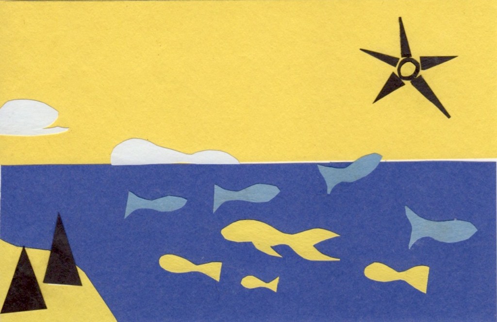 15. Démonstration — Déchirer et découper des éléments : placer le noir en haut et le blanc en bas de l’image pour représenter l’hiver, déchirer ou découper la forme d’un oiseau dans du papier blanc et le placer dans le ciel noir ; pour l’été, placer le jaune en haut et le bleu en bas de l’image, déchirer ou découper la forme d’une tente (ou tipi) dans du papier noir et le placer sur une plage jaune.