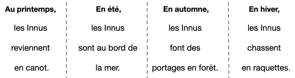 7. Récapitulation — Que font les Innus selon les saisons ? Coller une photocopie d’une phrase décrivant ce que font les Innus selon la saison choisie, page 5.
