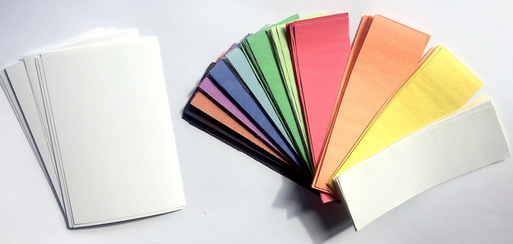 Couper des bandes de papier (construction), format env. 3 x 8,5 po (2 par élève) : jaune, rouge, bleu, orange, vert et violet, blanc et noir.