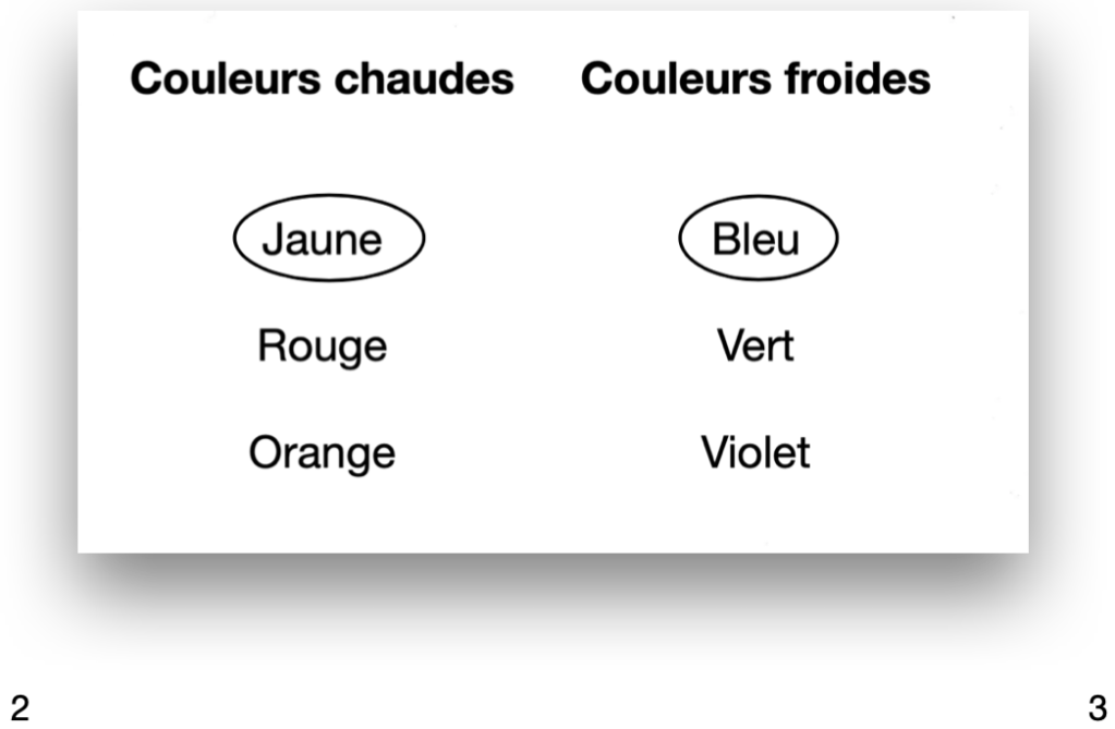 Page 2 : coller une photocopie OU écrire le nom de trois couleurs chaudes, entourer une couleur.