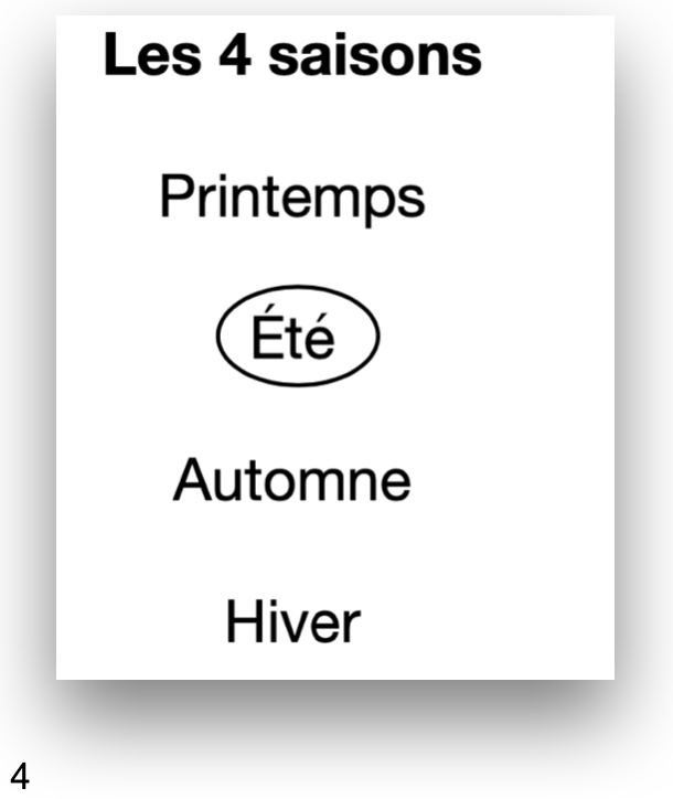 4. Quelles sont les quatre saisons ? Coller une photocopie OU écrire le nom des quatre saisons en français, page 4. Choisir et entourer une saison.