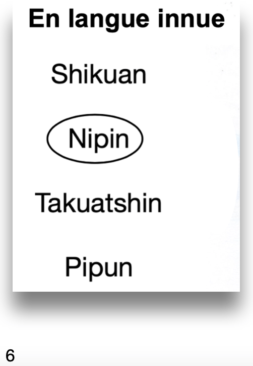 5. Coller une photocopie des quatre saisons en langue innue : printemps/shikuan, été/nipin, automne/takuatshin, hiver/pipun, page 6. Entourer le nom d’une saison (en langue innue). Écrire le nom de la saison choisie en haut de la page couverture.