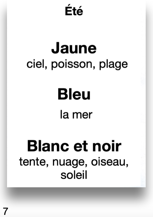 Page 7 : coller une photocopie des deux couleurs retrouvées à la saison choisie (plusieurs noms d’éléments se retrouvent sous les couleurs).