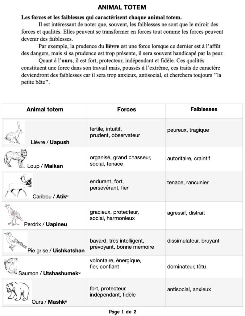 6. Organiser l’information — À tour de rôle, piger une image sur laquelle se trouve un petit dessin d’animal. Lorsque tous les élèves ont pigé, piger une seconde fois, mais cette fois, on ne peut garder une image identique ou l’image d’un animal appartenant au même allié, les deux animaux doivent avoir un maître différent (p. ex. : l’aigle est l’allié de Ushuapeu, maître des animaux volants et le caribou est celui de Papakassiku, maître des animaux terrestres).