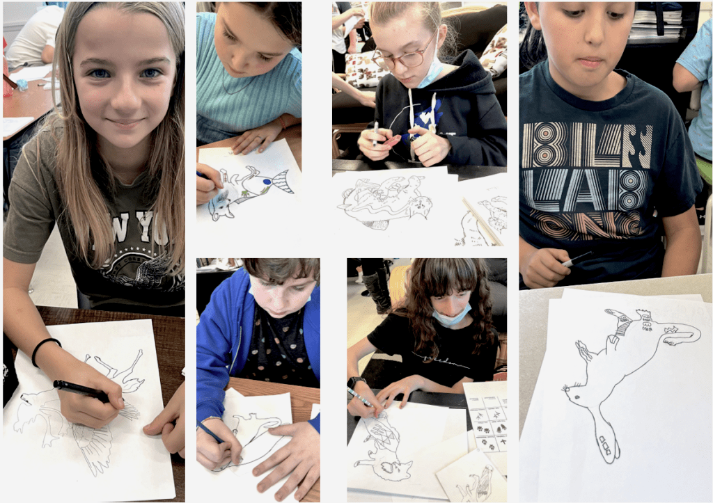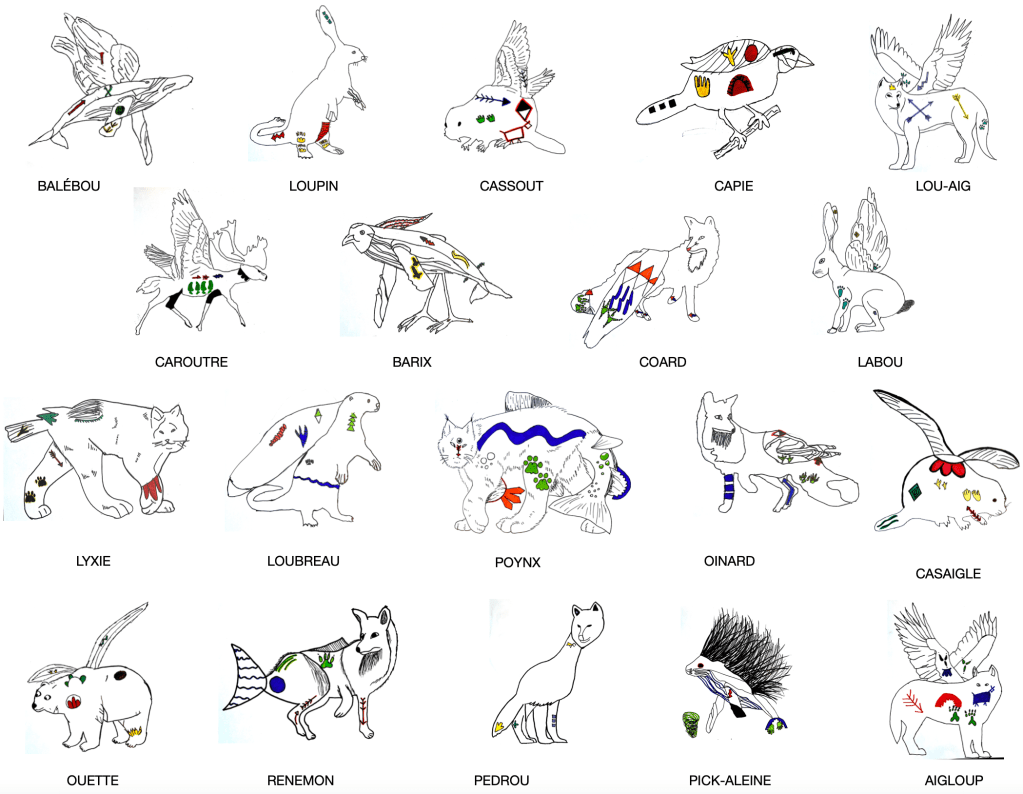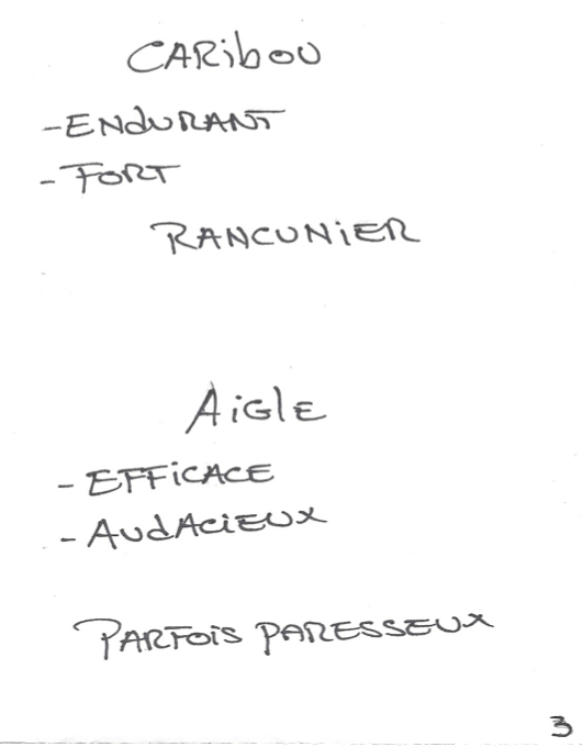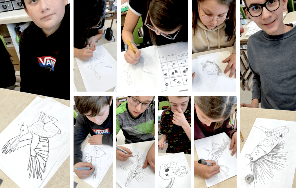 – L’élève termine son carnet de traces et trouve un nom pour son animal : prendre les deux noms, utiliser la ou les premières syllabes de l’un et la ou les dernières syllabes de l’autre (p. ex. : caribou et aigle et = carigle).