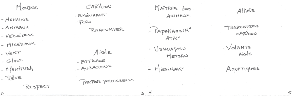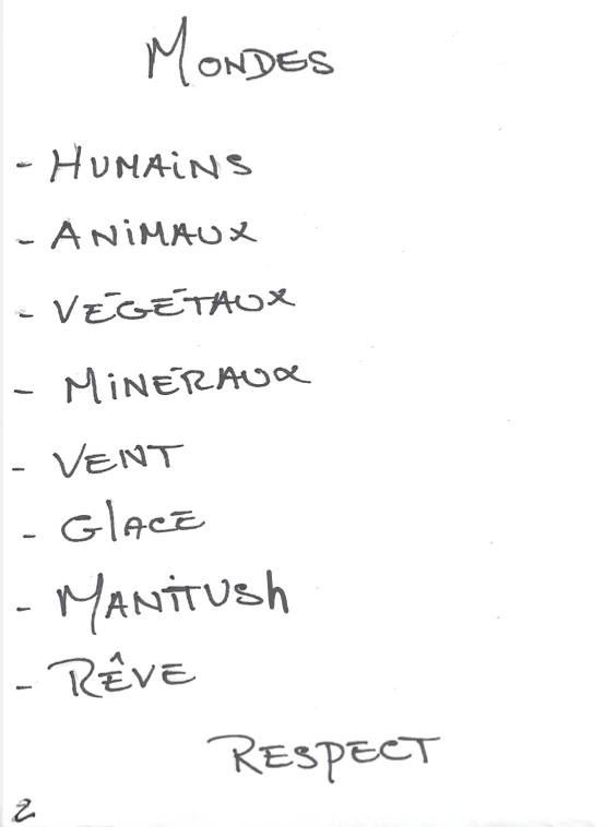 4. Prendre connaissance d’un problème — Quels sont les mondes dont on parle dans la vidéo ? Le monde des humains, des animaux, des végétaux, minéraux, du vent, de la glace, des manitushat (bestioles nuisibles aux humains) et du rêve. Écrire les huit mondes, page 2. À l’aide d’exemples simples tirés de la vie quotidienne, trouver les valeurs véhiculées par les Anciens — Comment peut-on y vivre en harmonie ? En étant respectueux de tout. Écrire « Respect » en bas de la page.
