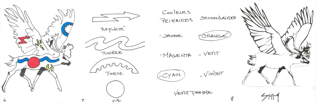 – L’enseignant s’assure que les informations suivantes figurent dans les carnets de traces : deux noms d’animaux et trois traits de caractères pour chaque animal (page 3), deux noms d’animaux en langue innue (page 4), quatre symboles et leur signification (page 7), trois couleurs primaires et trois couleurs secondaires dont deux entourées, une couleur tertiaire (page 8).