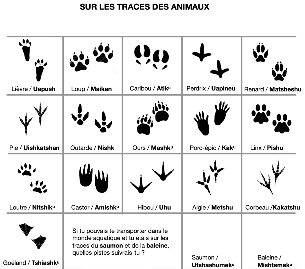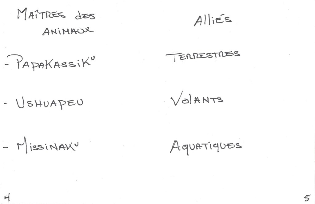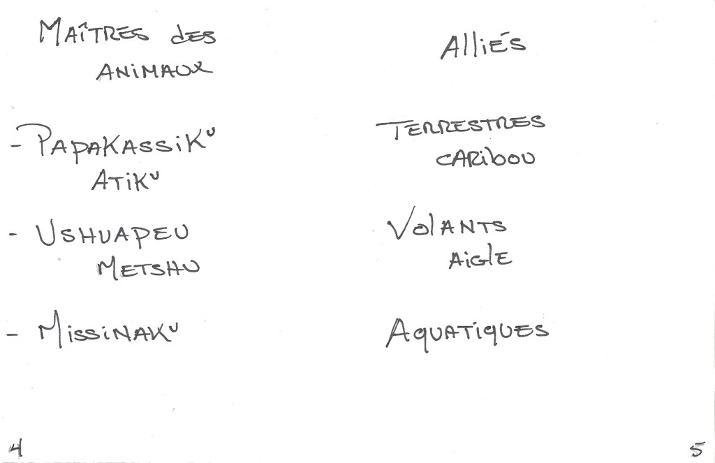 9. Écrire le nom de ces deux animaux en langue innue sous le nom de leur maître, page 4. Écrire le nom des animaux pigés sous le nom de leur allié, page 5.
