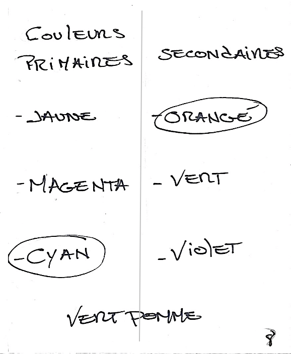 Page 8 : écrire le nom des trois couleurs primaires et des trois couleurs secondaires ; entourer le nom d’une couleur primaire, d’une couleur secondaire ainsi que d’une couleur tertiaire.