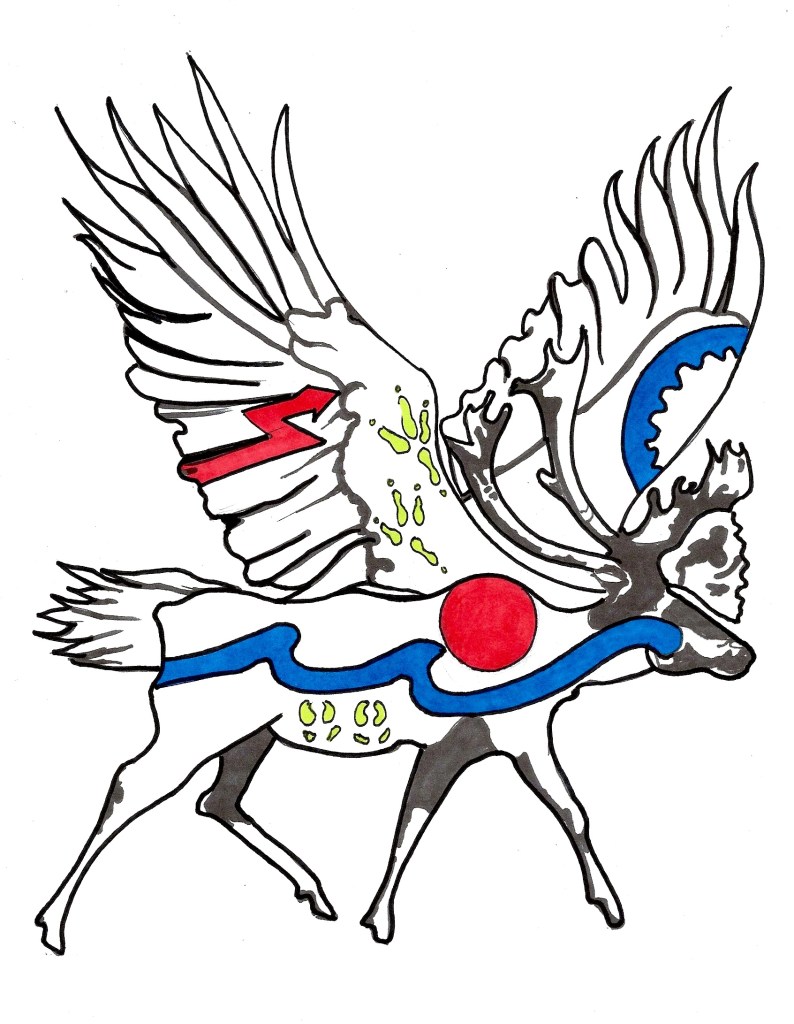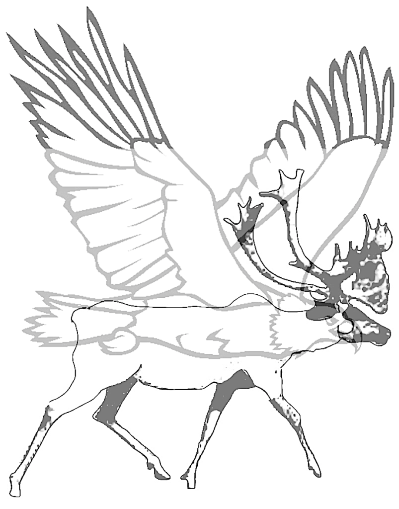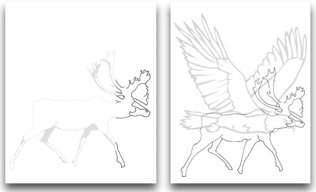 7. Découper grossièrement les images. Placer les images de façon à ce que l’on ne voie plus qu’un animal (p. ex. : placer un aigle sous un caribou et réaliser un caribou volant).