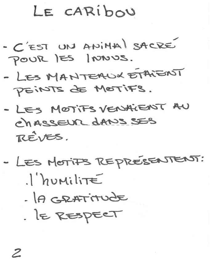 2. Visionner la vidéo sur le mode de vie des Innus — Cuir et caribou — Production Manitu inc. Durée : 3 min 36 s. Identifier le matériel qui servait à fabriquer les vêtements — Ouvrir une discussion sur l’importance du caribou pour les Innus.