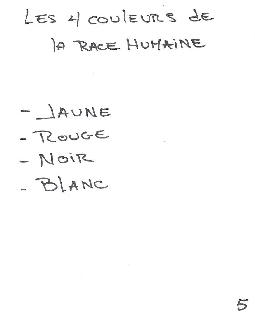 8. Quelles sont les quatre couleurs de la race humaine selon les Innus ? Jaune, rouge, blanc et noir. Écrire, page 5.