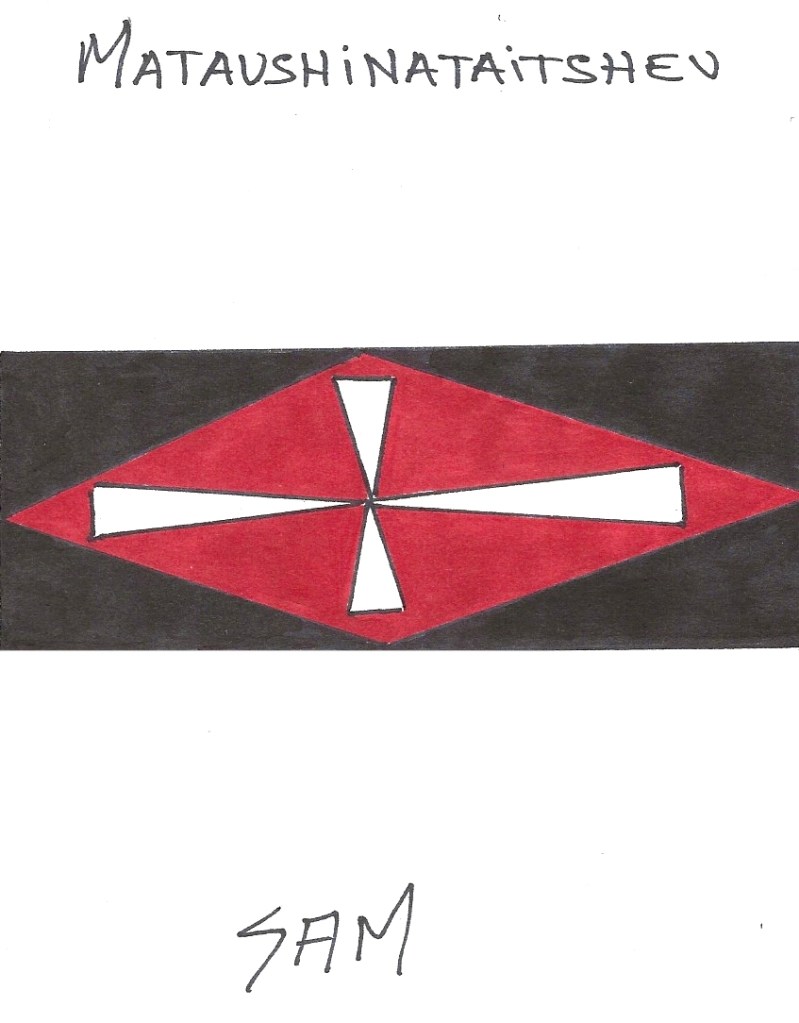 PAGE COUVERTURE : écrire son nom en bas, au centre ; dessiner un motif au centre ; écrire « Il/elle dessine des motifs » en langue innue « MATAUSHINATAITSHEU », en haut de la page.