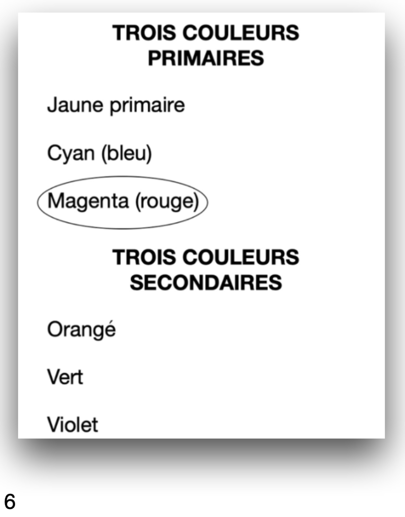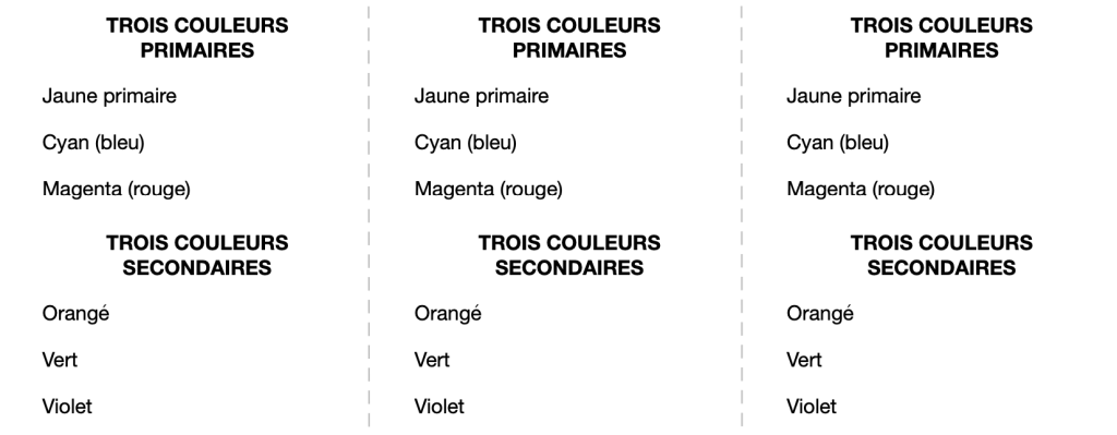 – une photocopie de la liste des trois couleurs primaires et secondaires