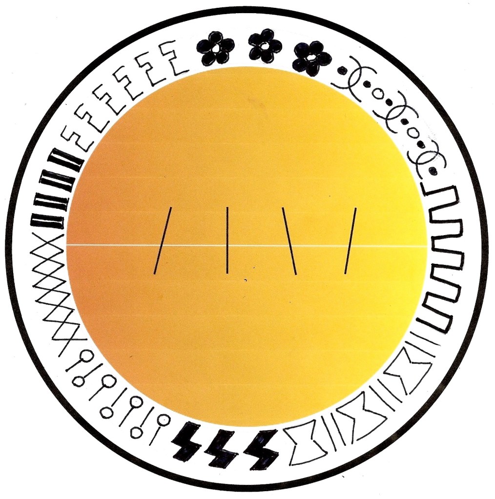 – L’élève termine les motifs sur sa plume ; sur la photocopie d’un tambour, il trace les motifs à l’intérieur des deux cercles au crayon à mine d’abord (comme sur la page couverture), puis il les retrace au crayon-feutre noir ; il découpe le tambour sur la ligne de contour.