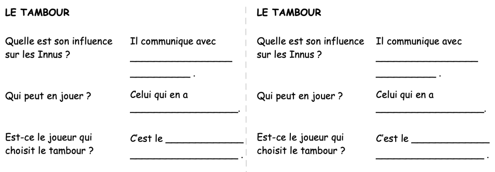 Page 2 : coller une photocopie sur le tambour et répondre aux questions suivantes : quelle est son influence sur les Innus ? Qui peut en jouer ? Est-ce le joueur qui choisit le tambour ?