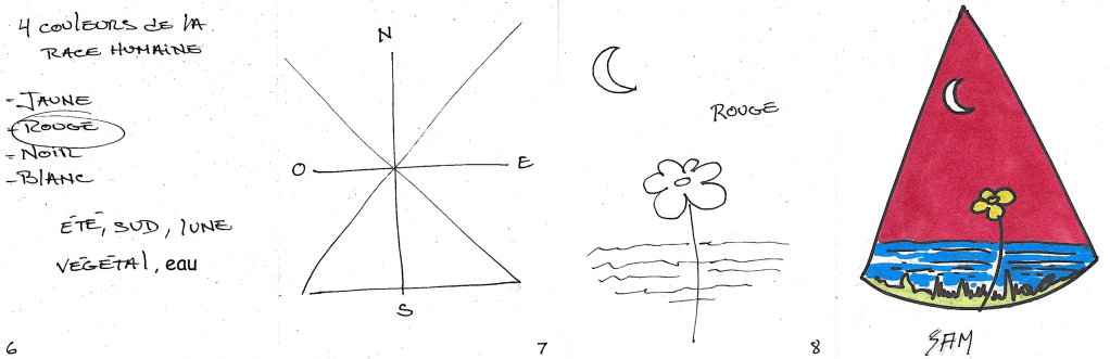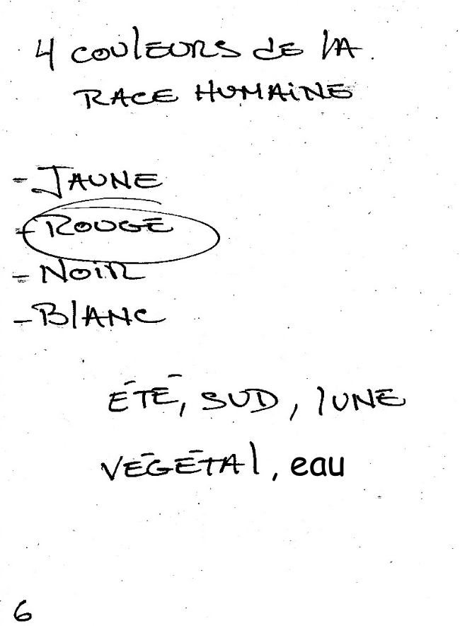 9. En haut de la page 6, écrire « 4 couleurs de la race humaine ». Piger dans un sac, une des quatre couleurs proposées et entourer la couleur pigée. À l’aide d’une photocopie sur les quatre éléments, écrire les éléments reliés à cette couleur (p. ex. : rouge, été, sud, lune, eau, végétal).